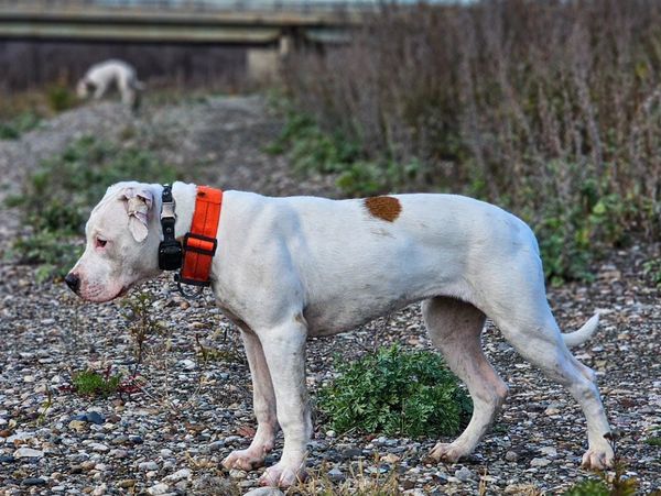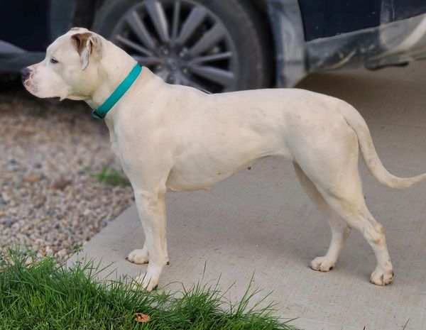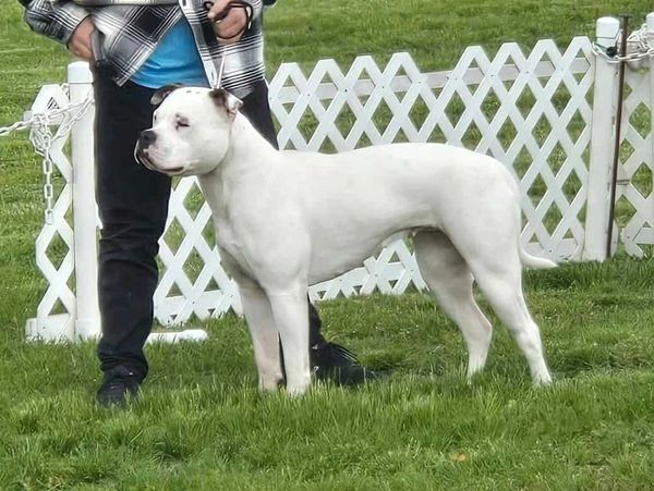 Roper Delta's On Fire lives in co own close by, and while she has passed all our health tests with flying colours, at this time we have no plans to use her in the program. She has beautiful pigment, full dentition and a reverse scissor bite. She oozes drive, with no dog aggression and is quite outgoing and social. She won 4 Best in Show Puppy over 2 shows and became a Junior Champion in 2023. Pictured at 14 months. She later finished her UKC Champion at a big well attended UKC event locally. She is one minor away from her NKC CH.