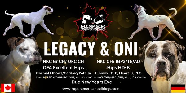 Legacy is an NKC Grand Champion and UKC Champion with 4/5 wins towards her Grand. She is a really fun working dog who favours heavily to defensive drive in work, but is super outgoing in public situations. She is a 24" lean muscled 80 lb female with a lot of prey drive and super handler focussed. Oni resides in Germany with Chestnut's Little Indians, and is a really nice example of the breed. He is a massive 27" male at 117 lbs. I met him in person and his temperament and movement is truly spectacular for such a large dog. He is an NKC Champion and a few points from his ABNA working dog Champion title with many titles in the sport of Schutzhund. All around, I expect really large standard type dogs.